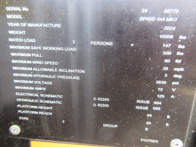 24V DC Electric Motor (Batteries), 2WD, Solid Non-Marking Tires, 3′ Deck-Extension, ½ Swing Entry, Folding Rails, SkyCoded, ECO, Live Elevate, Pothole Protection System, Power to Platform, Weighs 3,236lbs
